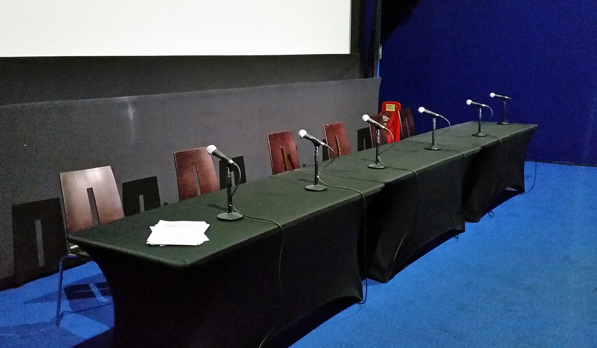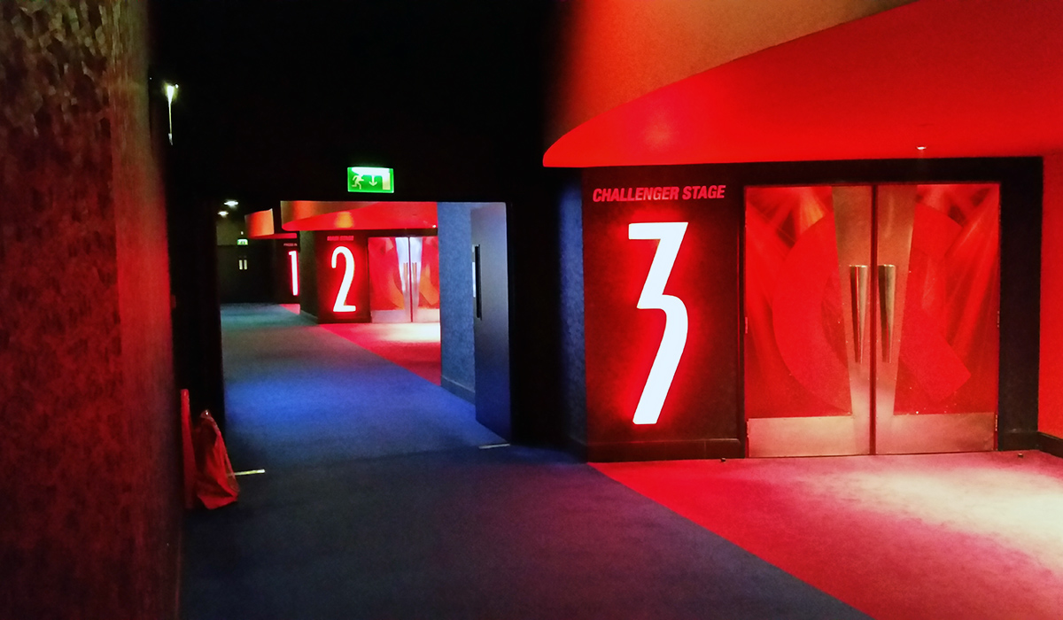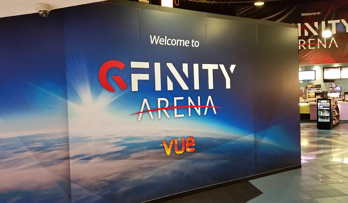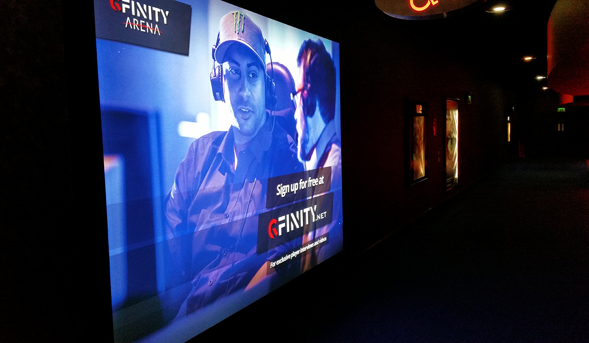 The Gfinity banner in the cinema's foyer.